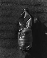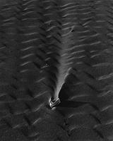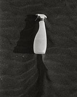 A plastic bottle folds over itself. The sand it rests upon makes way for its foreign shape. Water and wind carve voids and build dunes around the bottle, highlighting its presence. The futuristic object is in dialogue with the earth.